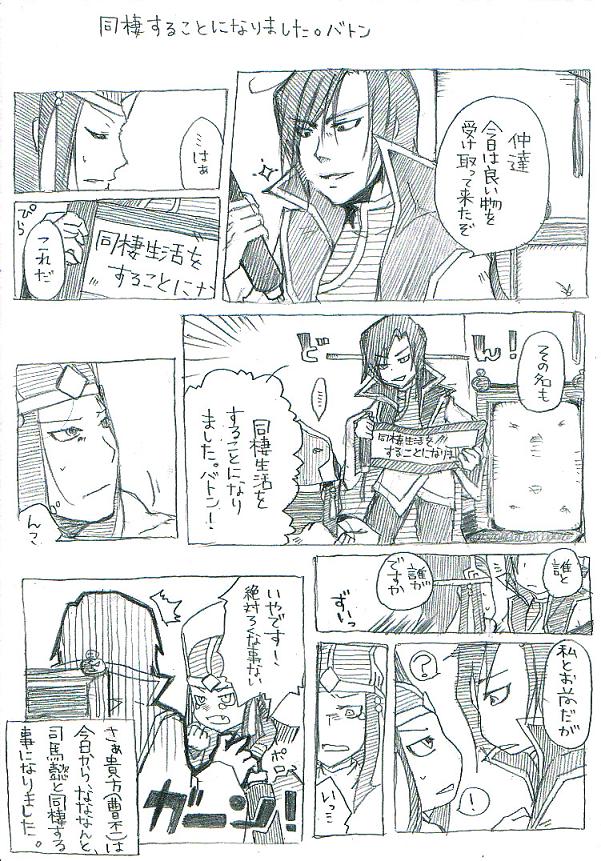 こうやってまわして頂けるのは有り難いです(笑)そう言う訳で司馬懿と曹丕の同棲バトンをお楽しみください。